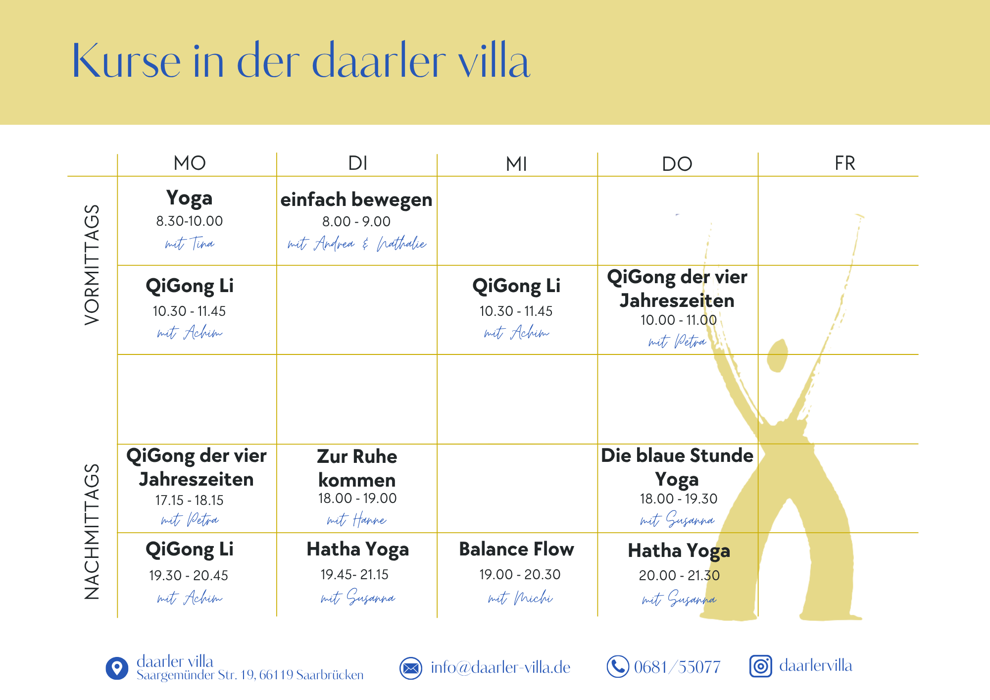 In der villa biete ich das „Qi gong der vier Jahreszeiten“ in der Form von Präventionskursen an. Diese werden durch die gesetzlichen Kassen bezuschusst. Ein Kurs umfasst dann 8x 60 Minuten. Zusätzlich gibt es Workshops zur Vertiefung der bewegten Form und Erlernen der stillen Form aus dem vier Jahreszeiten Qi Gong, und gerne biete ich auch Einzelstunden an, auf Anfrage.